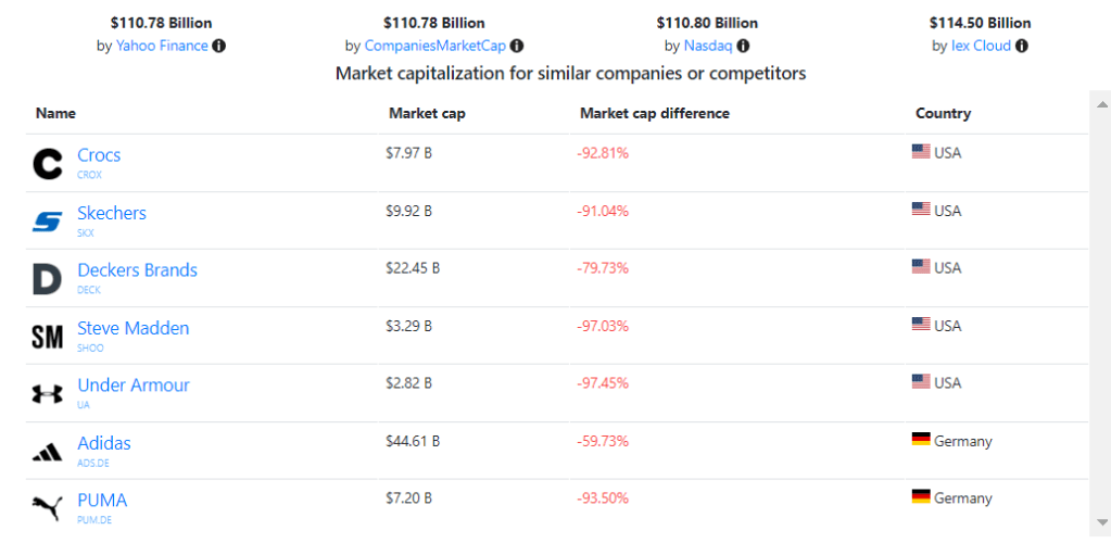 - Nike ja no s’emporta els contractes dels jugadors punters que apareixen, mirem el cas de Messi o Lamine. Com pot ser que se li escapin aquests actius a Nike estant a dintre de la casa? Manca de visió o d’apostar amb convicció. Recordem que Nike continua sent la marca de roba esportiva amb una capitalització a borsa més elevada, amb $110B. A sota veieu com els competidors són empreses molt més petites (Adidas val menys de la meitat i Puma ni una desena part).